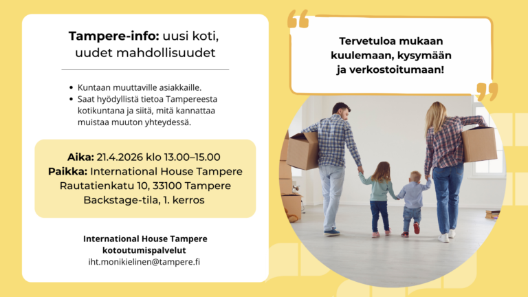 International House Tampere järjestää säännöllisesti tapahtumia, jotka tukevat kansainvälisten asukkaiden kotoutumista ja helpottavat siirtymistä suomalaiseen työelämään ja opintoihin. Tapahtumat tarjoavat myös mahdollisuuksia verkostoitua paikallisten yritysten kanssa. Lisäksi artikkeleistamme löydät hyödyllistä ja ajankohtaista tietoa toiminnastamme.