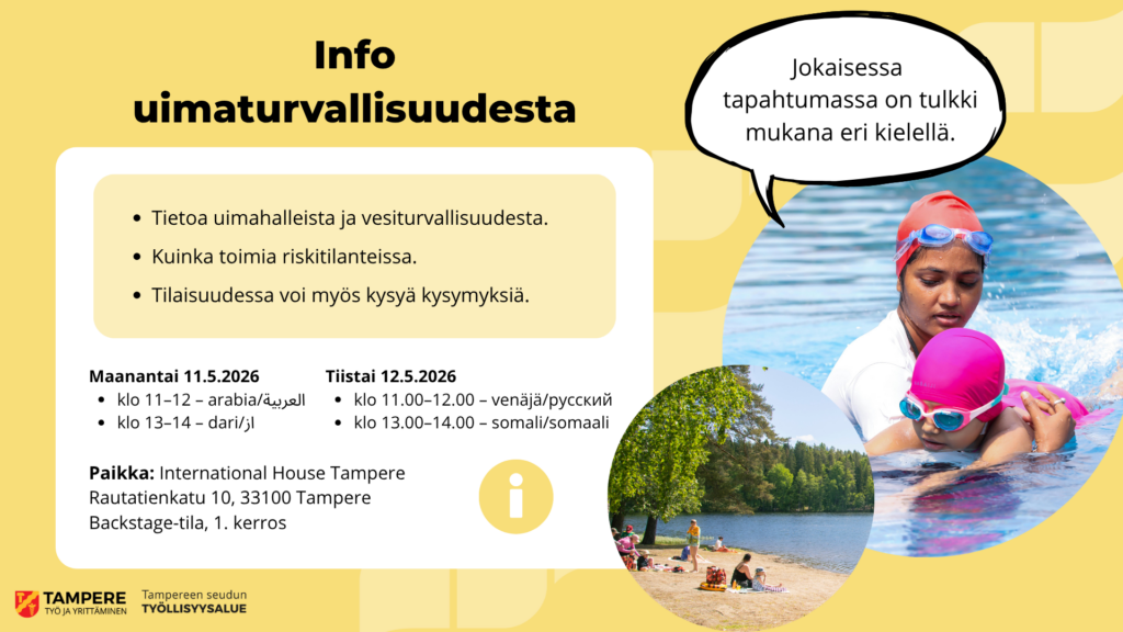 International House Tampereen kotoutumispalvelut järjestää yhdessä Tampereen kaupungin liikuntapalveluiden kanssa 4 erillistä tietoiskua uimaturvallisuudesta.